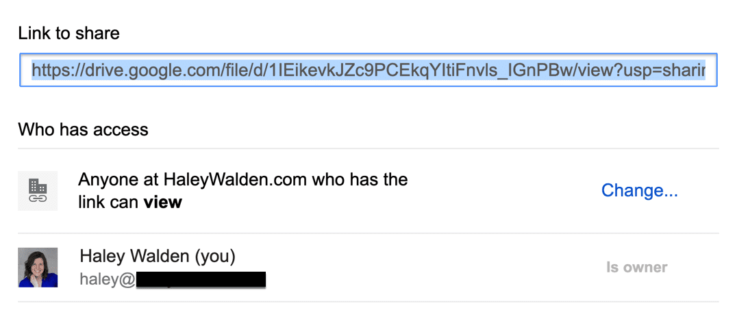 3. You’ll see a menu with several options. First, you’ll see a clickable area that displays the status of the file. (In this case, it’s “Anyone with the link can edit”–meaning anyone you send the link to can alter the file.) You’ll also see an area where you can copy a shareable link and share your file with specific people.