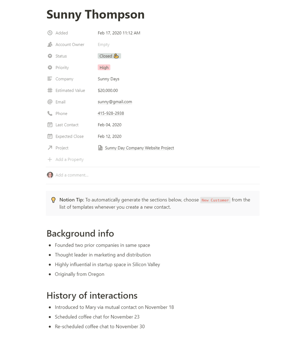 A table in Notion is actually a relational database! This means you can connect your CRM data to any other table anywhere in your workspace.