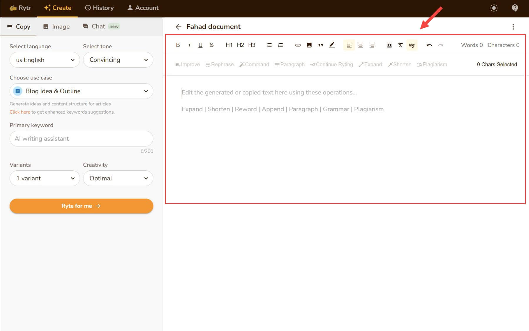Rytr’s Rich Text Editor is pivotal to its content generation capabilities, elevating the platform beyond standard text editors. Upon generating the content, Rytr AI seamlessly opens it in the Rich Text Editor, which, on the surface, appears akin to any conventional text editor. Users are greeted with a familiar interface featuring a typing window and a toolbar with formatting options.