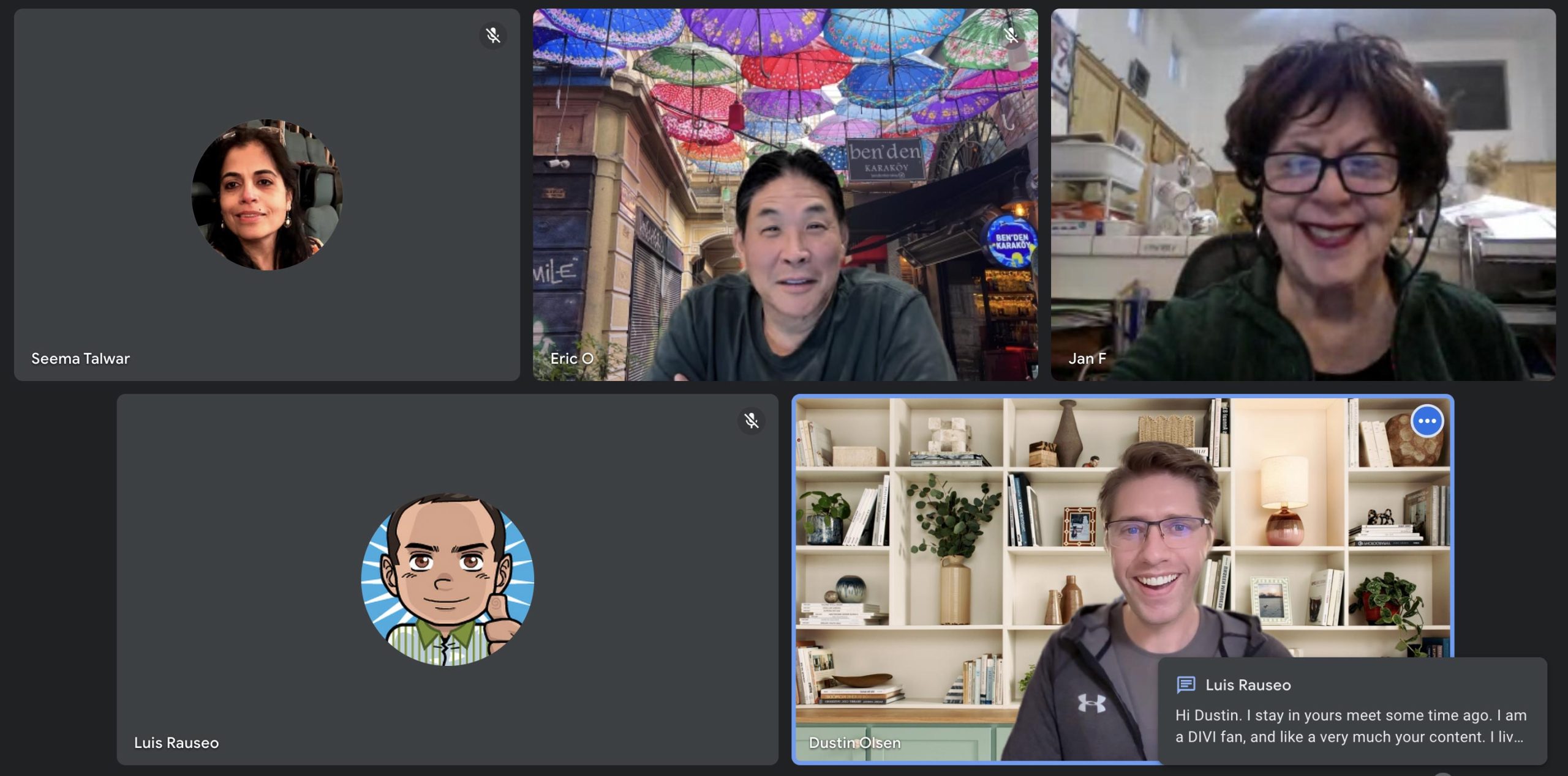 It’s been a while since I updated our Divi community with meetup happenings, so get ready to be turbo-updated. From Mega Meetups to your friendly Divi DFW regularly scheduled virtual meetups, a lot has happened. Our Divi community is buzzing with excitement and creativity.
