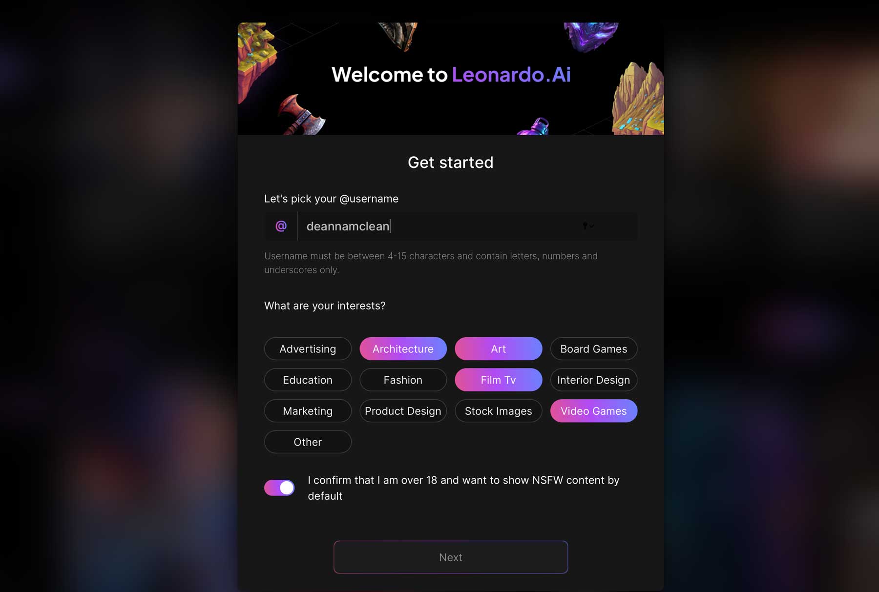 Next, you’ll pick a username, choose your interests, toggle the not safe for work (NSFW) on, and click the next button.