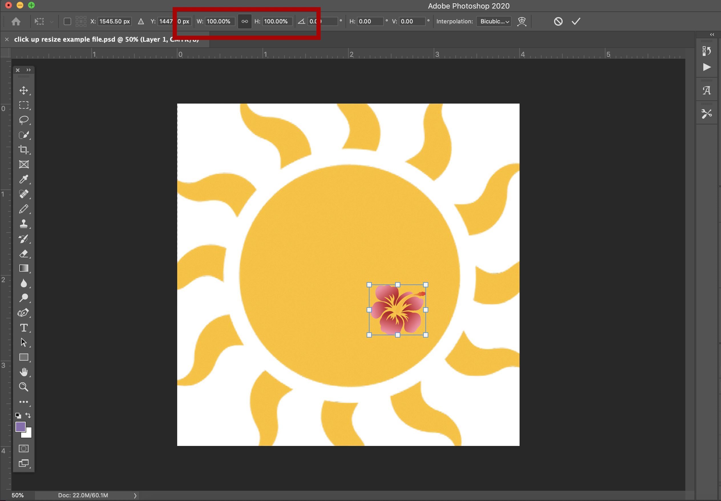 There’s one other option for sizing here. Whether you choose Scale or Free Transform, you can use the handles on the bounding box as described above, or you can set the (H) height and (W) width percentages manually in the Options bar.