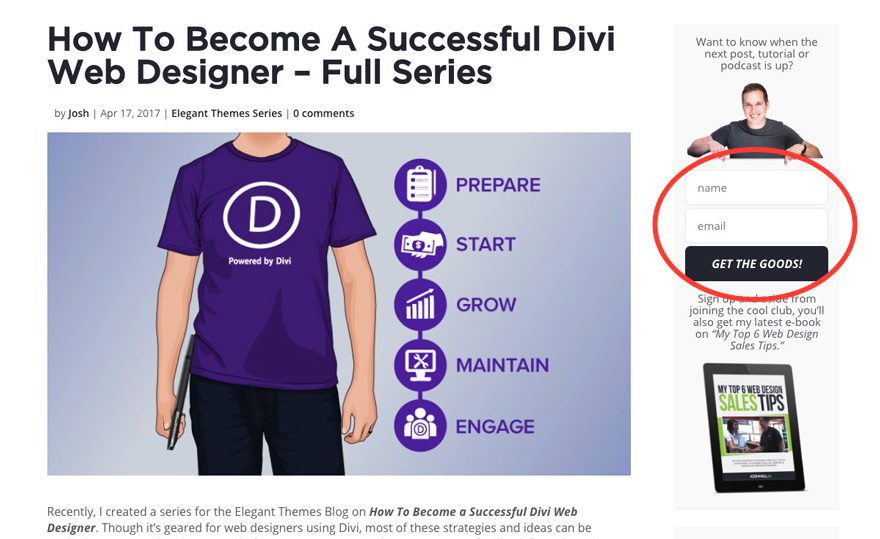 Here, I have it at the top right of each post template along with a strong visual above and below the main sign up form. So if you have pages with sidebars, remember that those areas are valuable real estate for strong call to actions! And you want to be sure and make your CTA’s noticeable and preferably at the top of the sidebar which will show up first on mobile below the main content.