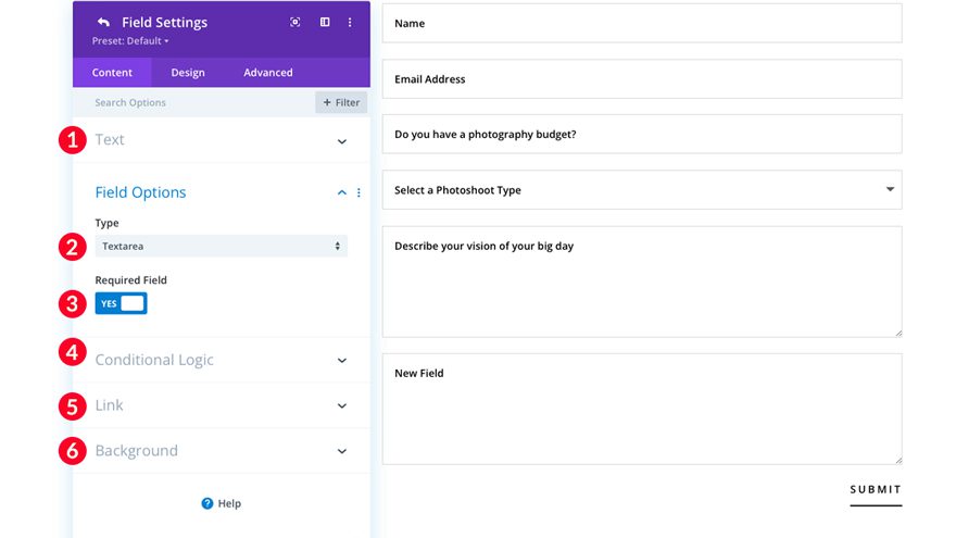 The input field is one of the most powerful fields you can use in your contact form. You can capture just about any type of text information. Acquiring a potential customer’s name, business name, physical address, phone number, or various other informational text are options. The possibilities are endless.