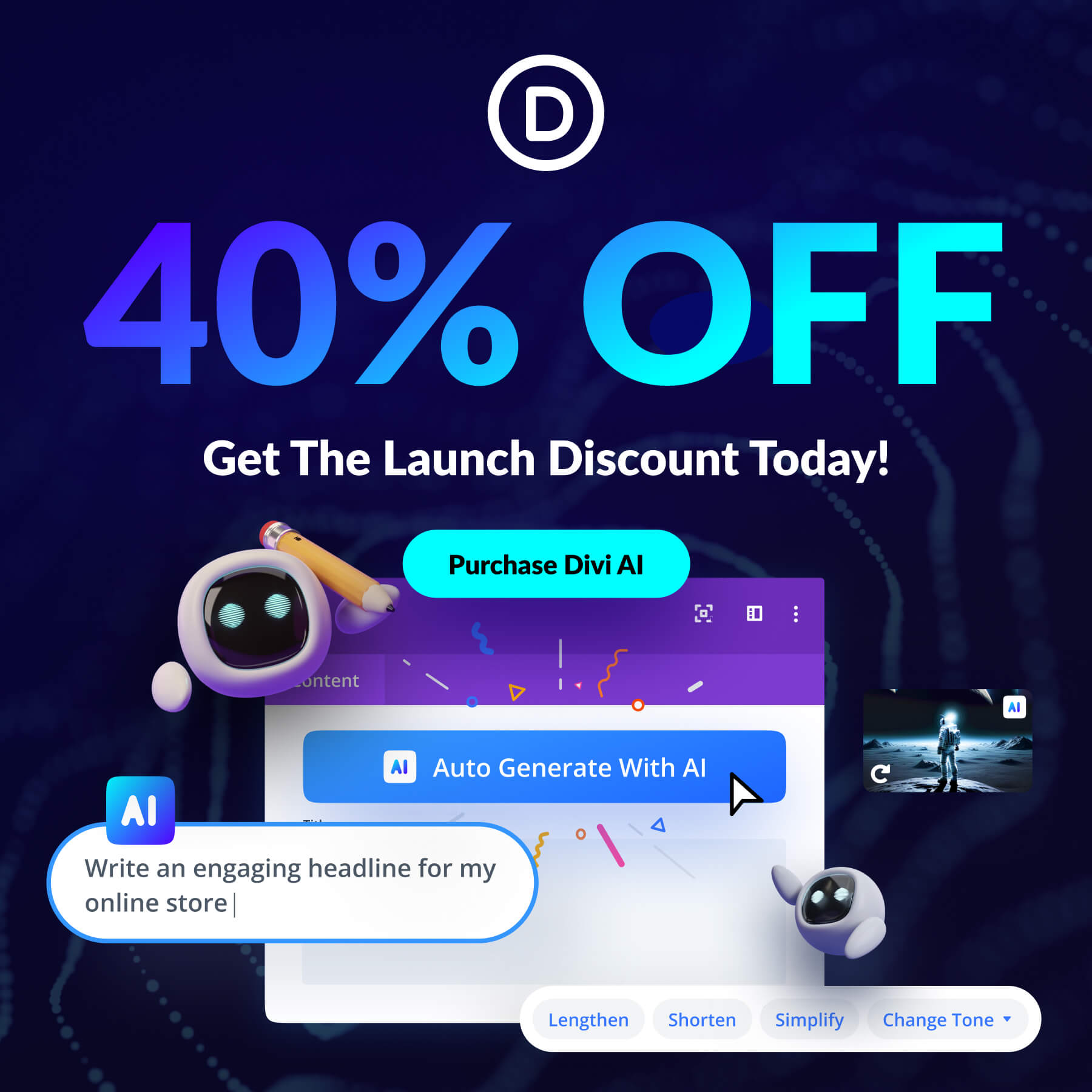 By the way, to celebrate the launch of Divi AI we are offering a 40% off introductory discount for one week. Now’s the time to lock in those savings forever!