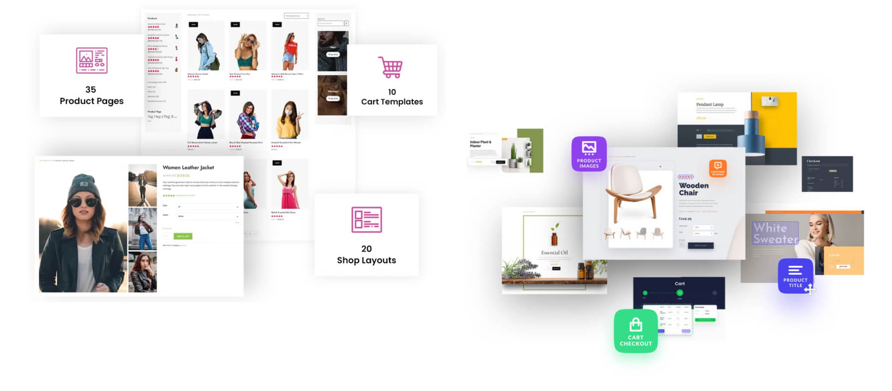 Woo Essential comes with tons of WooCommerce layouts, templates, and unique modules to help design all the important eCommerce pages (like Shop, Cart, Checkout, Product, and more). Standout features include WooCommerce wishlist functionality, quick view product information popups, product comparisons, mini cart, and advanced filterable product grids.