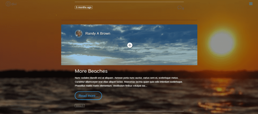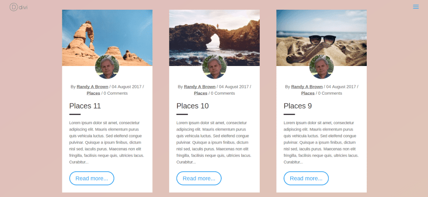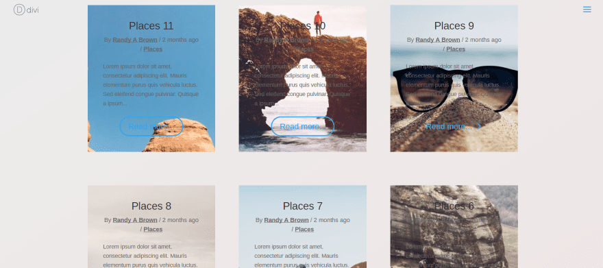 The default settings displays the featured image with the author’s Gravatar overlapping the bottom of the image. This is followed by the post meta, title, a line, post excerpt, and read more button with hover animation. I’ve added a background in the section to help it stand out.