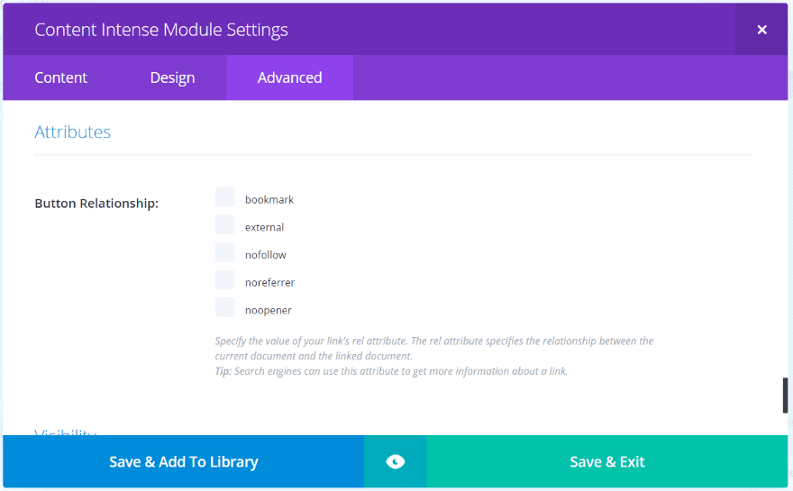 The Advanced than includes button relationship features so you can specify the value of the link’s rel attribute. This is great for creating bookmarks, setting a link to nofollow, etc.