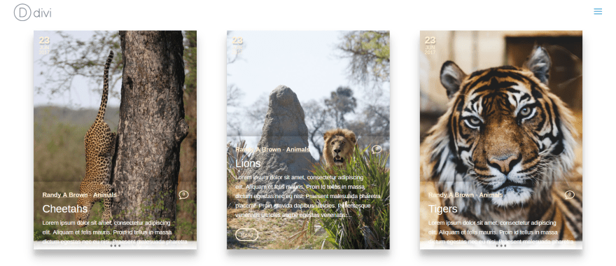 Of course an overlay does look good. I’ve added a black overlay and changed the opacity so a little bit of the image shows through. The date in the upper left corner also uses the overlay. I changed the button to text and moved it to the right. I like those three dots and line at the bottom of the cards. It’s a small detail that adds a touch of visual flare.