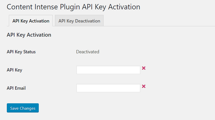 Upload and active Content Intense just like any plugin. Once the plugin has been activated you’ll see a new menu item within Settings in the dashboard called Content Intense Plugin Activation. Click this and enter your API Key and email, and save changes.