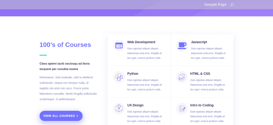 This one uses Elegant Themes’ free Code School layout pack. I’ve replaced the first two icons (the blurbs for Web Development and Javascript, which actually use images rather than icons), changed their colors and size, and added a circle to match the other icons. The first is from Material Icons. The second is from Font Awesome.