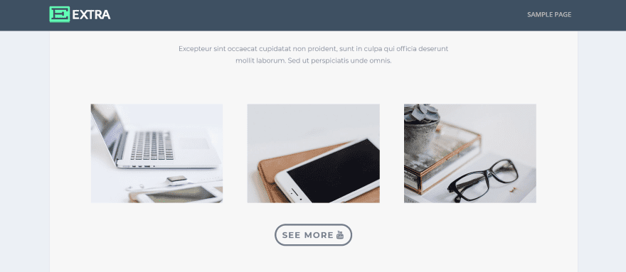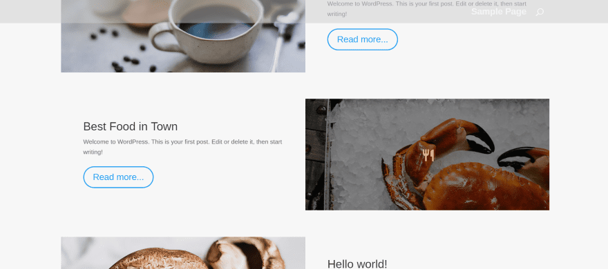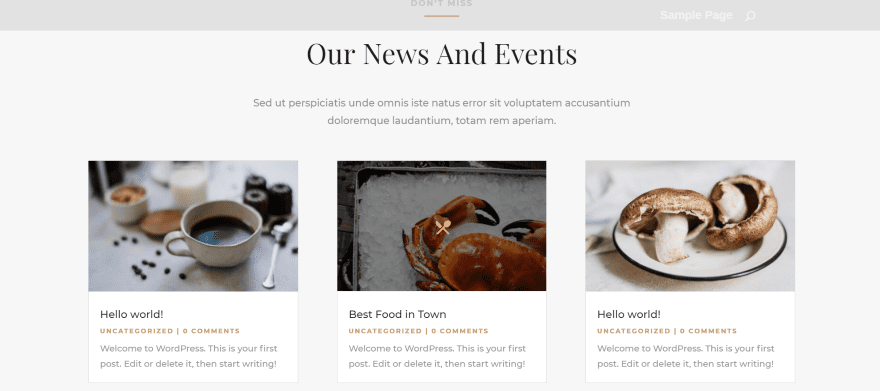 This one is from Elegant Themes’ free Restaurant layout pack. I’ve added an overlay with icon to the blog post images and placed a fork and spoon icon from Material Icons (as you can see in the center image).