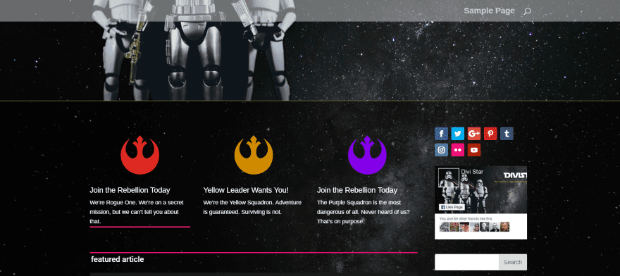 Since I found the Rebellion icon I couldn’t resist using it. Here’s an example using the free DiviStar layout pack by Geno Quiroz. I added blurbs and the rebel icon from Font Awesome – each one with a different color. I made them as large as possible. The controls are the same as normal Elegant Themes icons.
