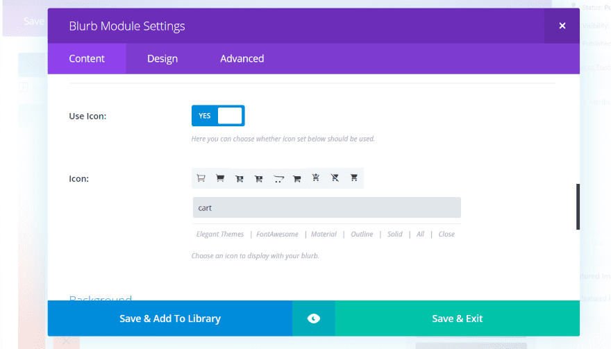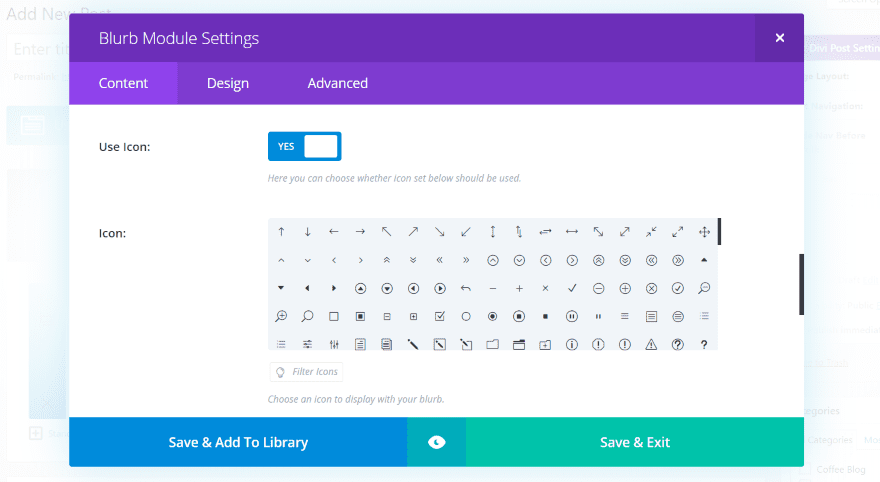 I found the filter useful even without using FontAwesome and Material Icons because it helps sort and find Elegant Themes’ icons, which speeds up development time. Don’t hit the enter key when you search. This will close the module.