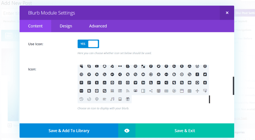 Divi comes with around 380 icons. The image above is a Blurb module before installing Divi Icon King. Within the Content tab, select Use Icon to see the icons that are available.