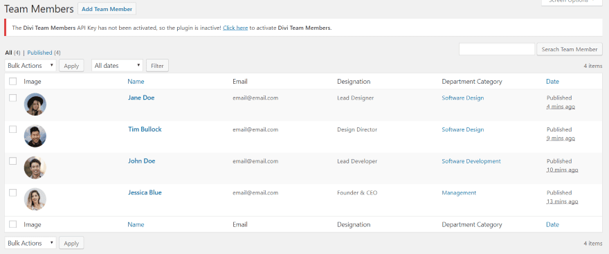 Once you upload and activate the Divi Team Members plugin you’ll need to activate the license. In the dashboard, go to Settings > Divi Team Members, and enter your API key and email.