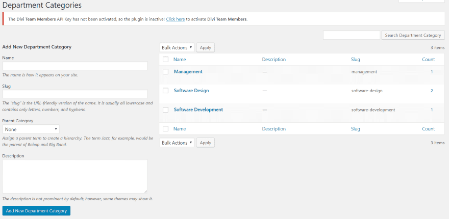 Department Categories works the same as normal WordPress Categories. Add the name, slug, parent, description, etc.