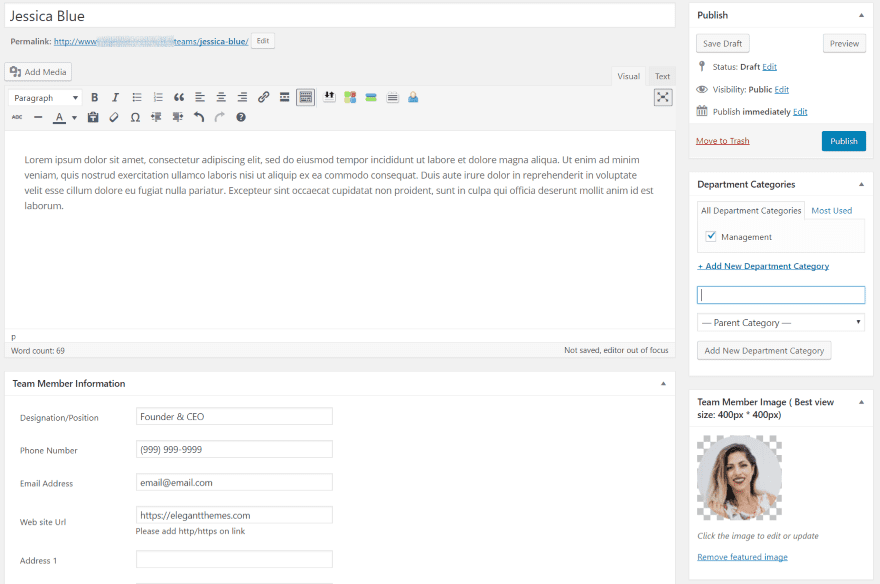 Create Team Member includes a TinyMCE editor, department categories, team member image, and team member information. Here you can add content and create categories just like with a WordPress post. Create the team member and hit Publish.