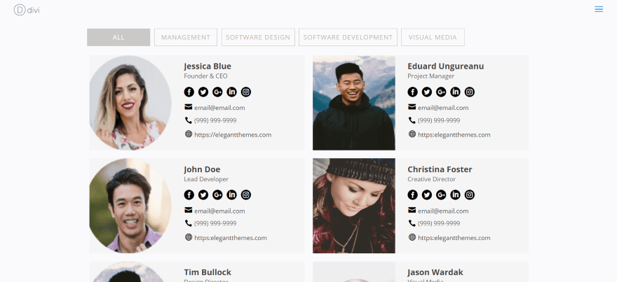 Divi’s Person module is a great way to showcase your staff. It includes a location for their name, position, social media links, description, and an image. It’s a simple module with all of the person’s information stored within the module itself. What if you wanted to add categories and select which team members to display based on those categories? What if you wanted to change the design for every team member at once? What about layout options or a filter?