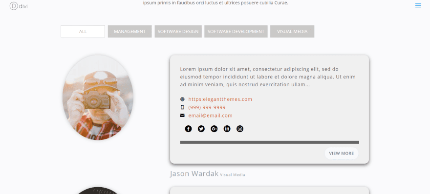 Here’s Team Members Grid with layout Style19 and filter button style 5. I’ve changed the button colors and added a background shadow to the cards to match. In this example I’m hovering over Visual Media in the filter to show the button animation.