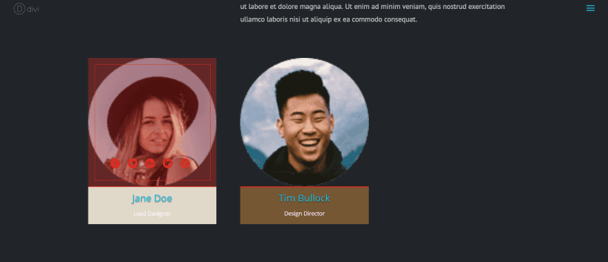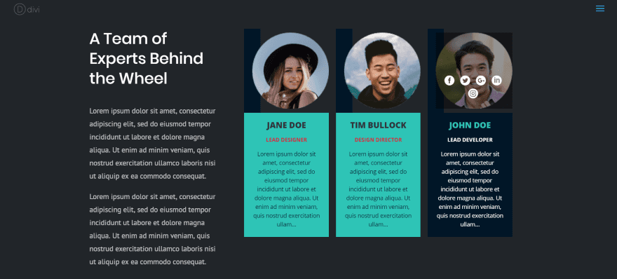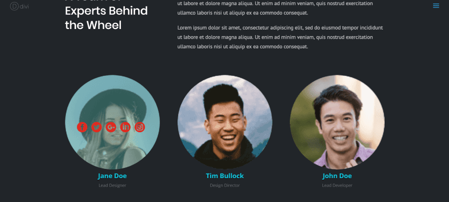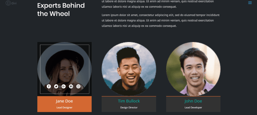 Let’s take a look at Divi Team Members and see what it can do. Images from these examples came from Elegant Themes layouts. I’m using a combination of squared and circled images.
