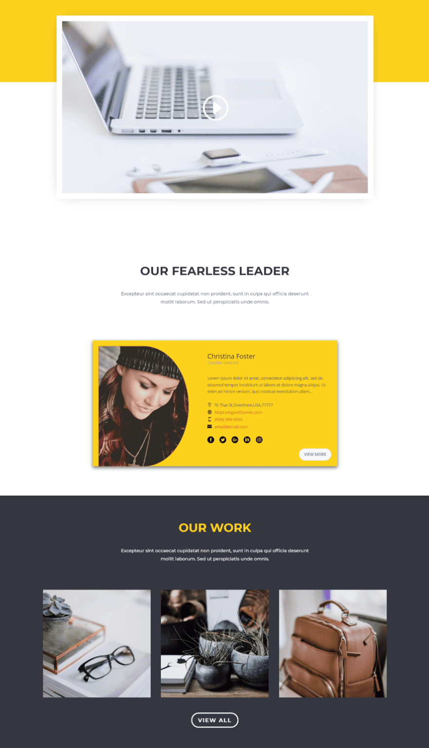 Here’s the Team Members Table module within the Our Work section of the Design Agency layout. I’ve styled the colors to blend with the site, using white for the text and yellow for all of the icons.