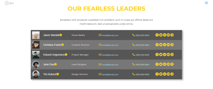 The Divi Team Members plugin adds 6 new modules to the Divi Builder: