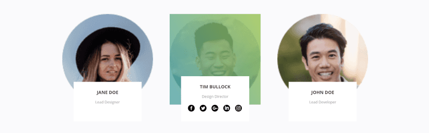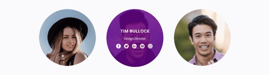 Here’s the same module using Style17 and Random for the team member selection. I’m hovering over the middle team member, which displays the social icons in an overlay. The colors are default.