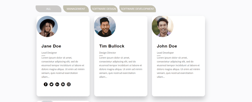 Here’s the Style1 layout for the Team Members Grid module. It adds a filter for all of the categories. This is filter style 1.
