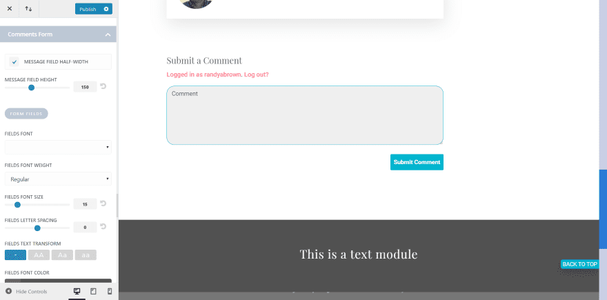 In this example, I’m customizing the comments form. You have control over the field’s colors (both focus and non-focus), border, text, colors, button, etc. I’ve changed the button background color, the field’s focus color, added a border to the field, and changed the radius.