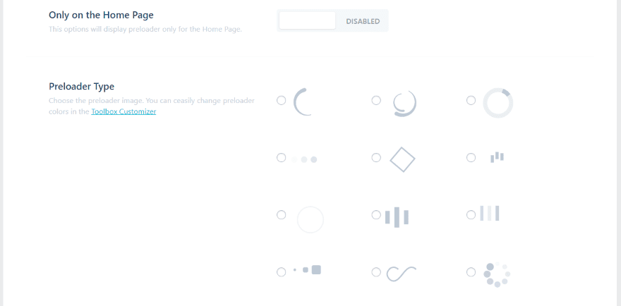 There are 12 preloaders to choose from. You can have them to only appear on the home page if you want, and select their transition type and speed. The selector screen shows the preloaders’ animations. You can customize them further in the theme customizer.