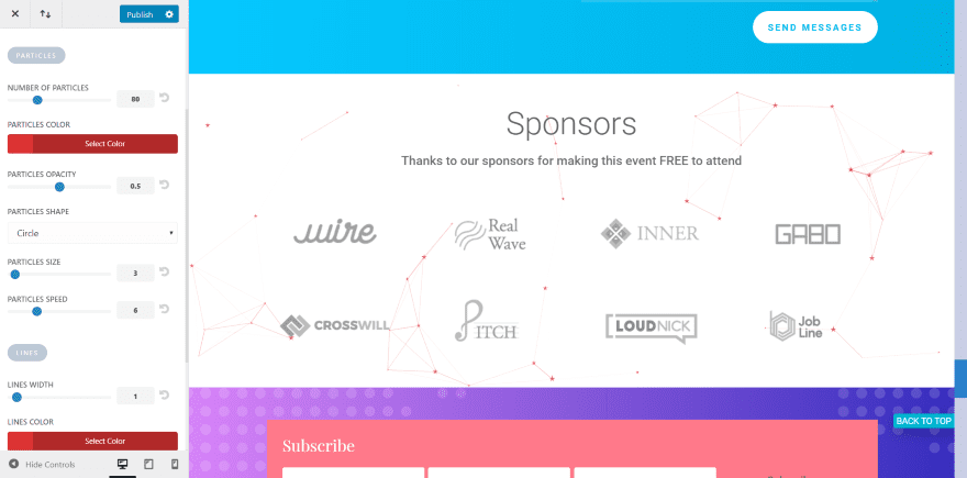 This is moving particles. You have full control over the color, shape, number of particles, speed, size, line size, opacity, and interactivity. There are two CSS ID’s for particles, letting you have two different designs.