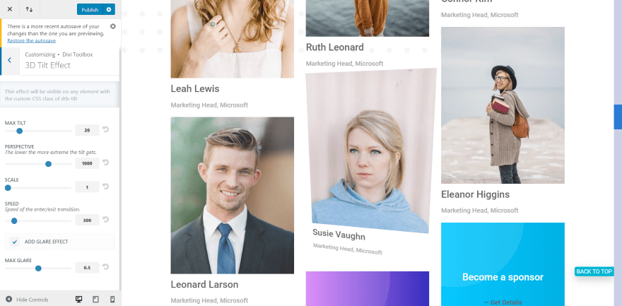 Here’s a look at the tilt feature. You can adjust the tilt, perspective, scale, speed, and glare. Add it to any section, row, or module.