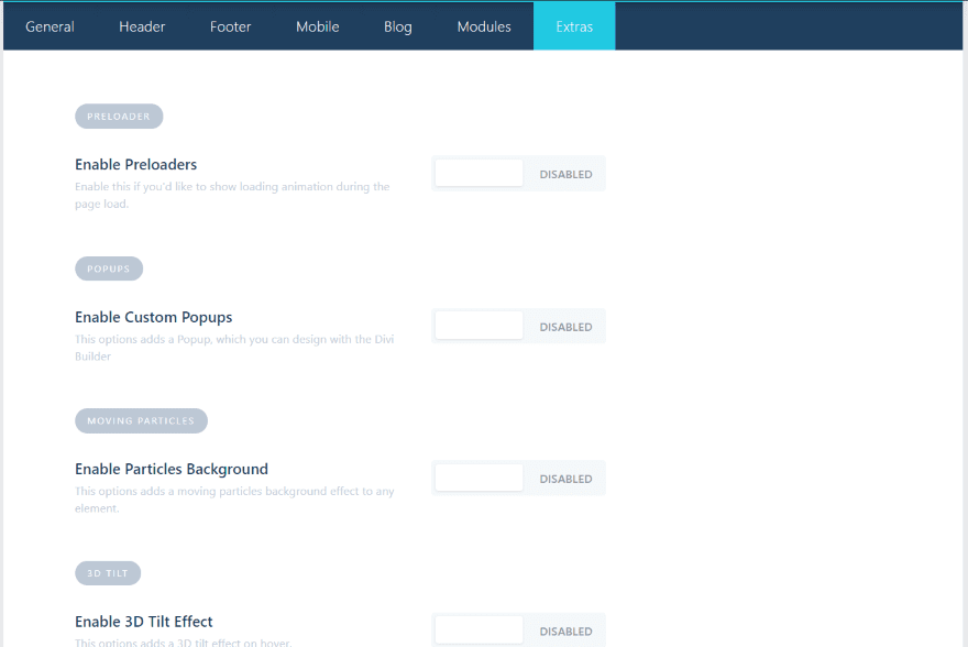 The Extras tab includes preloaders, popups, particles background, 3D tilt effect, and parallax scrolling for modules.