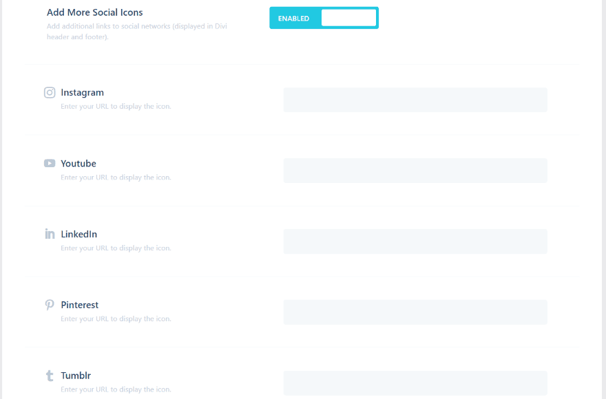 Adding more social icons opens a field where you can enter the URL for 9 more social networks.