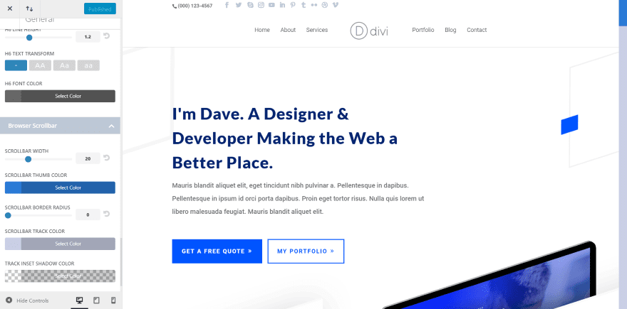 Here’s the General tab in the customizer, where I can adjust the settings that I enabled. Settings include headings and fonts, the browser scrollbar, and the login screen. In this example, I’ve made a few adjustments to the h1 and body text and added styling to the scrollbar. I’ve also added more social icons.