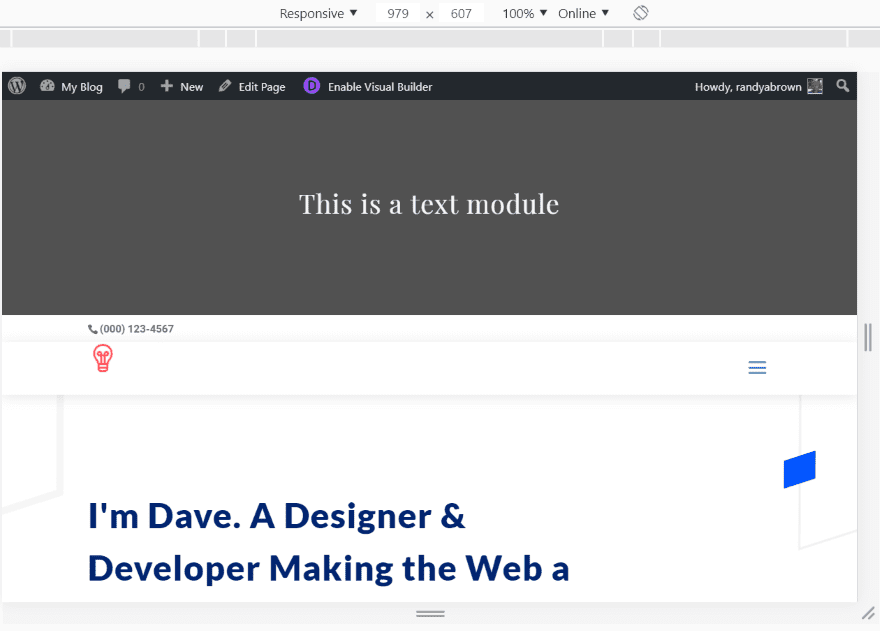 Here’s a look at the page in Google Chrome with Responsive selected. As soon as I took the screen size less than 980 pixels it changed to the mobile icon that I selected and added the hamburger menu with animation that I chose.