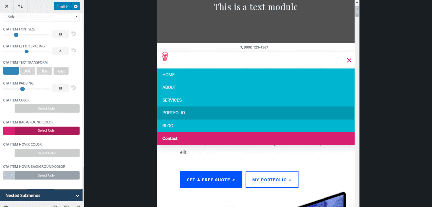 In this screen, I’m styling the mobile menu’s background color, hover background color, and hamburger menu. I’ve changed the text for the main menu items to all caps and left the CTA text standard. I also changed the background for the CTA menu item. You can also adjust the menu and icon size.