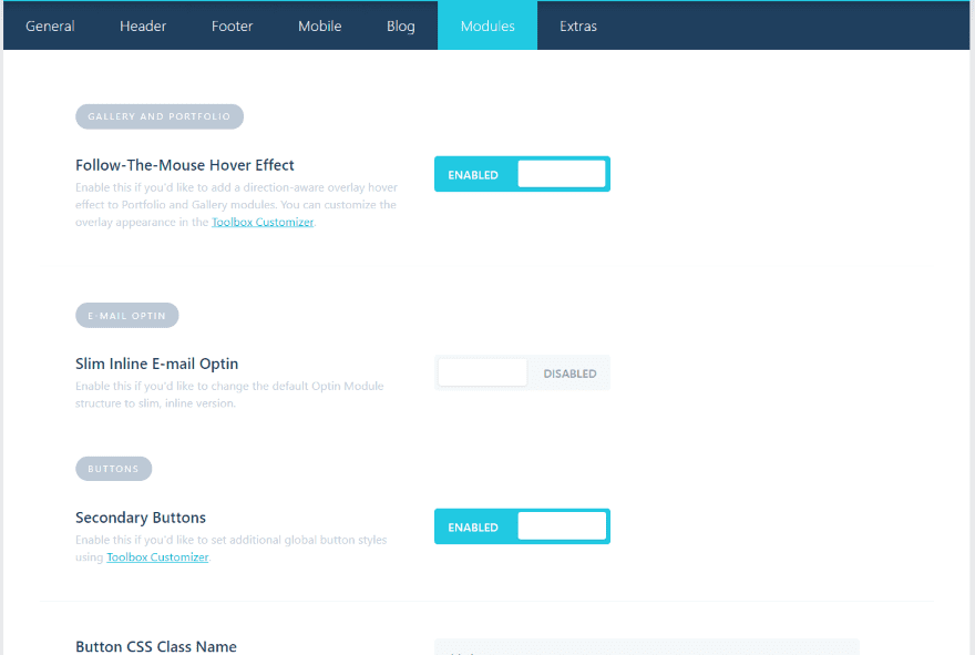 The Modules tab provides settings to add a follow-the-mouse hover effect, add a slim email opt-in (it provides CSS for three different options), secondary buttons (which adds a new layer of customization), and lots of tweaks.