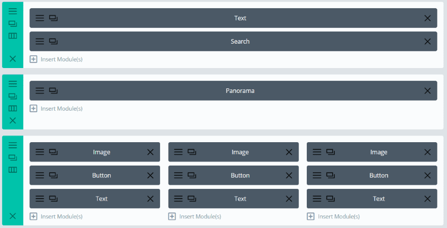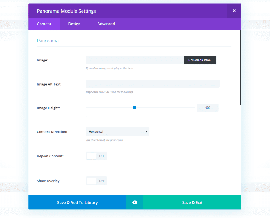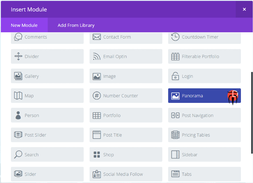 A new module is added to the Divi Builder called Panorama. It’s dark blue and includes the publisher’s logo, so it stands out nicely.