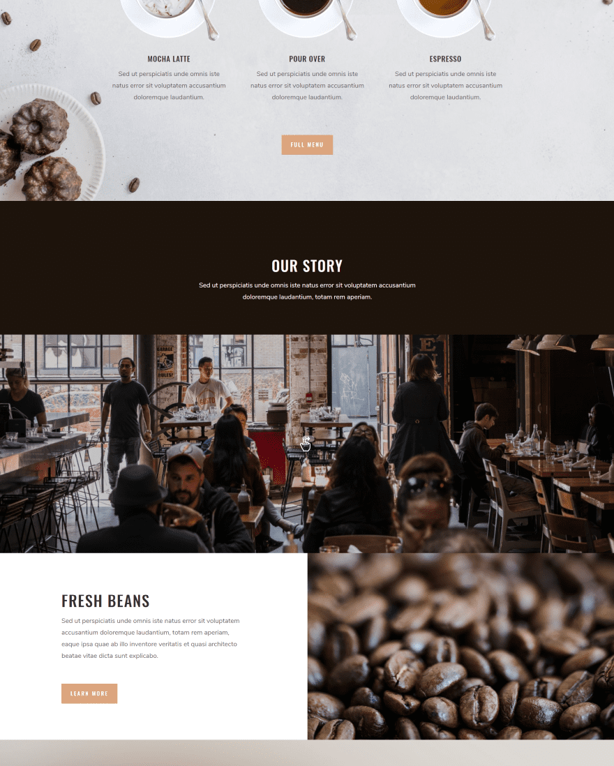 Here’s another example of how it looks within a layout. In this example I’ve placed a horizontal panorama within the Coffee Shop layout pack, replacing the video module to show a 360 degree photo of the coffee shop. It uses a black overlay with 20% transparency. It looks great as it is, but I think this would look even better with a larger icon.