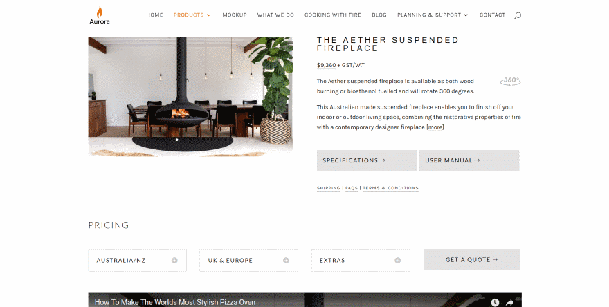 This one uses a clean design for the two-column shop module, which displays a large image over the title, text, and button for each item. The product page displays an image slider, all the expected text, styled buttons, toggles for the pricing information by country, embedded video, and another round of toggles for all the information about the product.