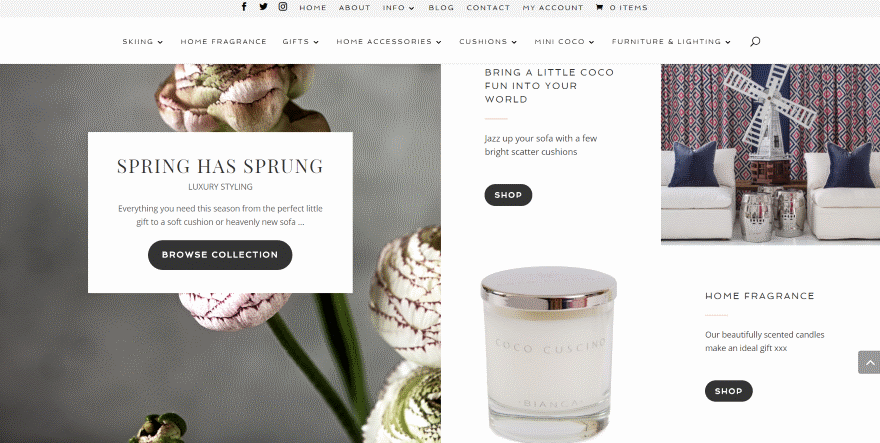 This layout includes lots of styled elements as links to shop categories. They include images, text, dividers, and buttons. The products include styled border and buttons. The individual pages display in full width and include box shadow for the product images, a styled divider, and a styled button.