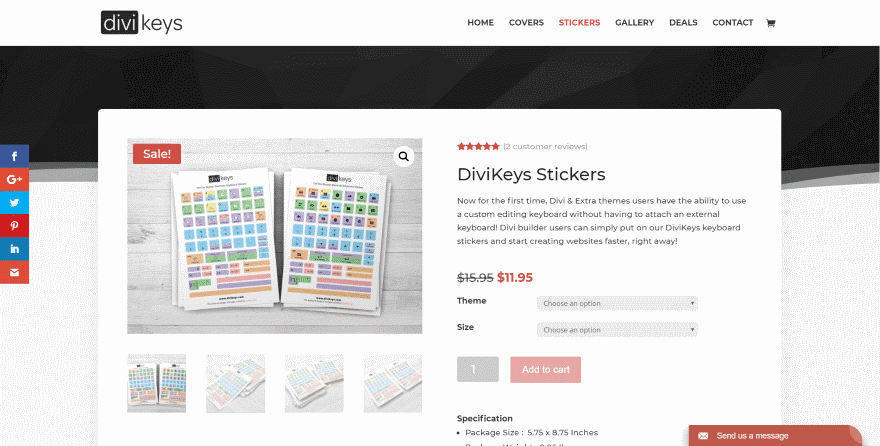 This one uses the Divi Builder to style the product pages, which place the products over a styled background with a boxed shadow. All of the product elements are styled with Divi including the text, buttons, sales badge, and reviews. Clicking on the featured image zooms the image inside its box while clicking the magnifier opens a full-screen gallery.