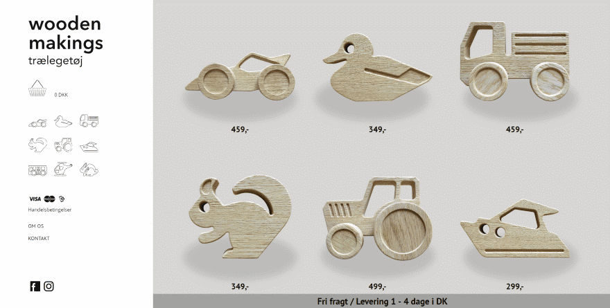 This one displays the products on the homepage as images with a shadow effect and a price. Hovering over the image zooms both the product and its shadow. Clicking on a product opens a product page with images in a slider and a description, and highlights the product’s icon in the menu to the left.