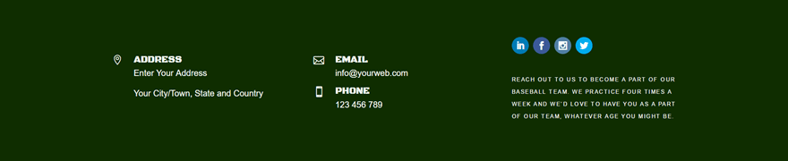 In this section, you can clearly see the power of images. It looks like the guy is throwing the ball right into your screen. This, again, reminds visitors on your website what the ultimate goal of your baseball team or sports club is. The focus is on the sport and that’s clearly shown in this part of the website. The blurbs give away 4 important parts of being a team player, whereas the stadium background shows what a possible future for a team player can look like.