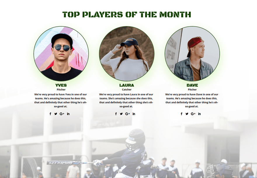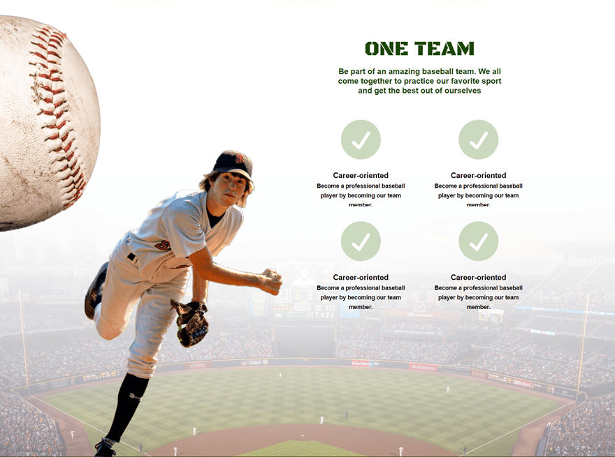 The hero section looks pretty straight forward. We’ve used a background image that reflects the emotions most baseball members have; focused, determined and ready. The high-quality image you show in your hero section will immediately have an impact on the overall website feeling. The more professional the image is, the more professional the baseball team or sports club will look like right away from the beginning.