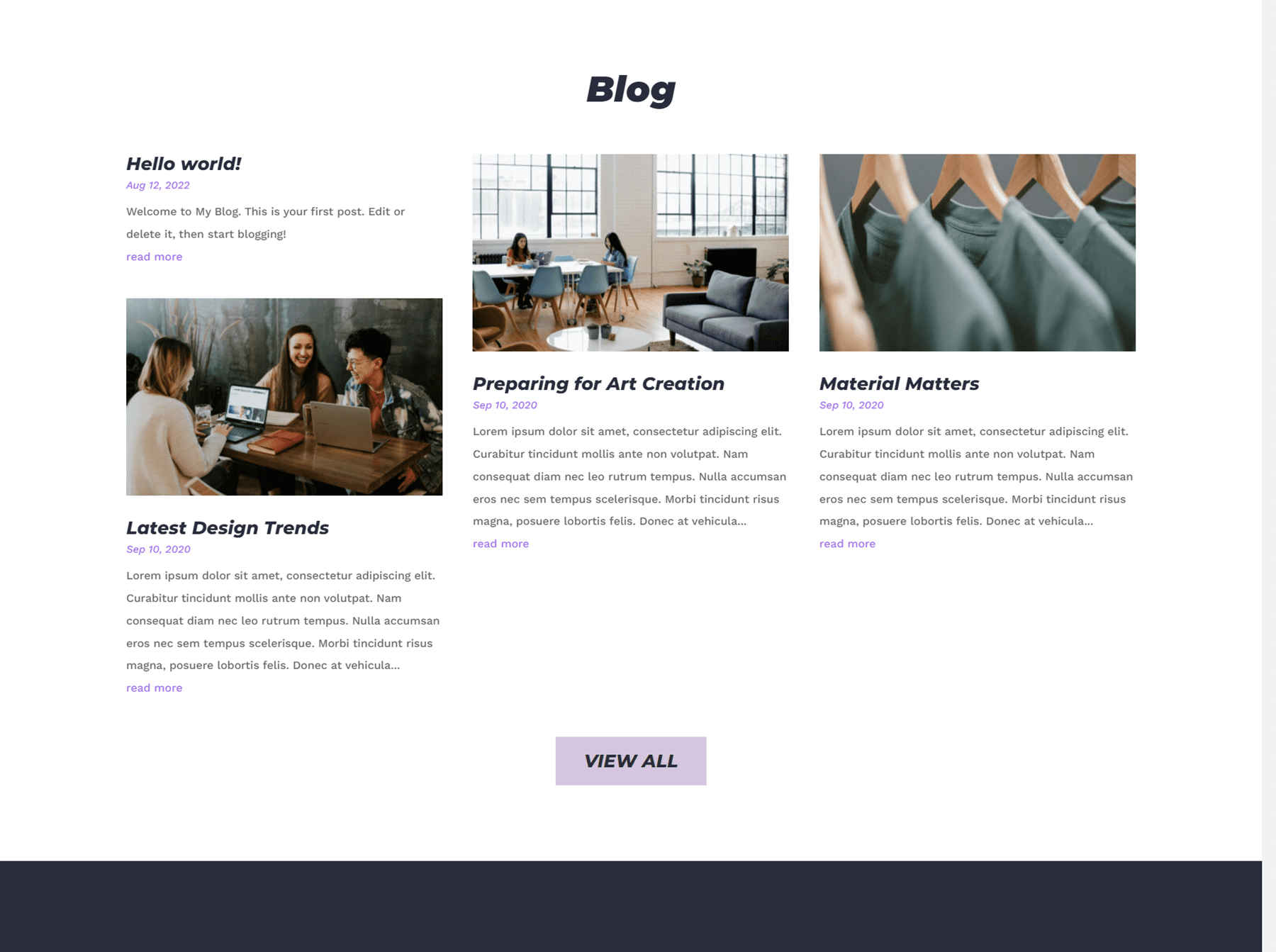 The blog page for this theme is very simple, with a large image showcasing the featured image, and the post title, date, and excerpt below.