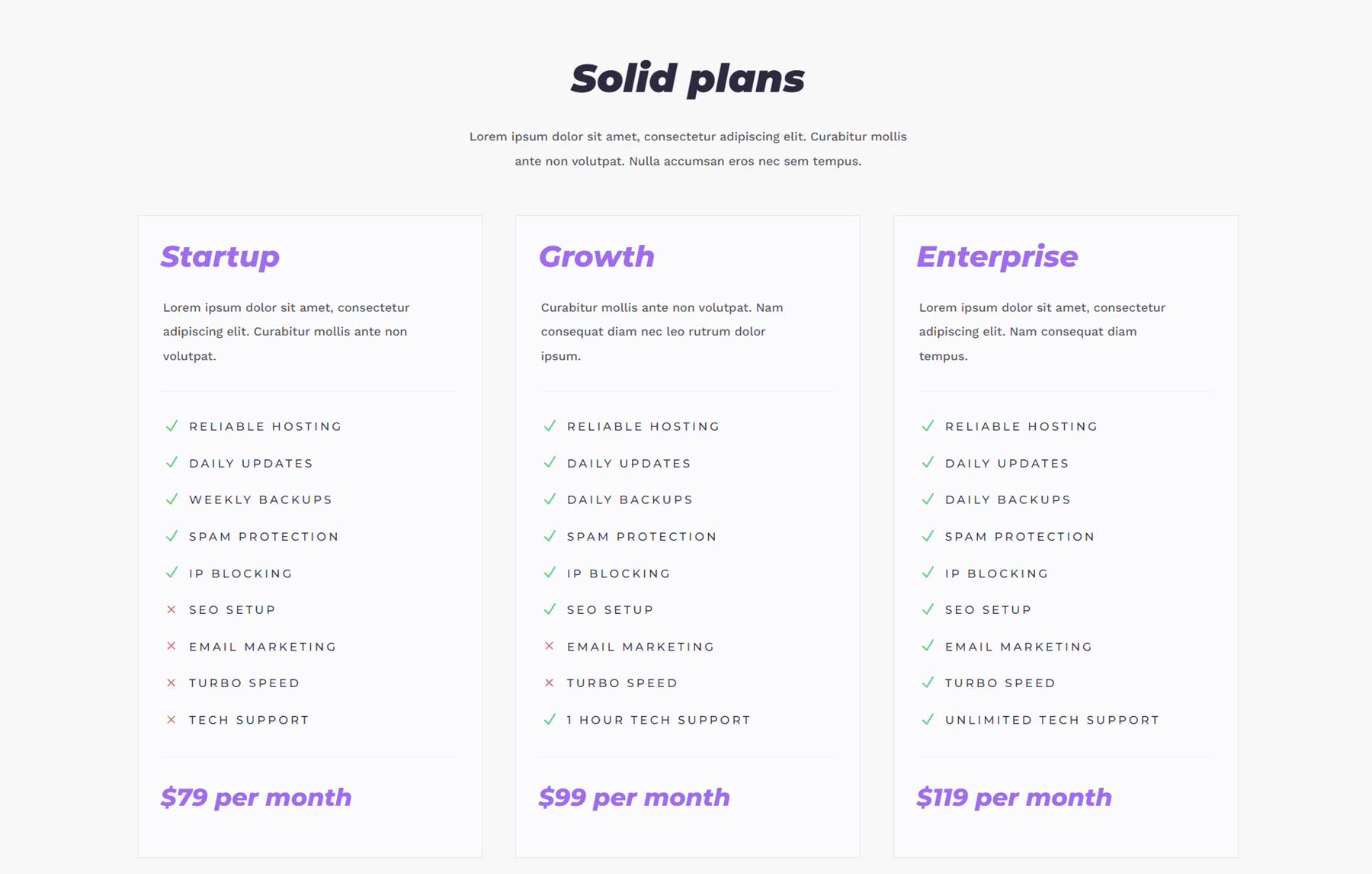 The third video section is on an image background with a dark overlay and has space for some text below. Like the others, this one also has a purple overlay on hover.