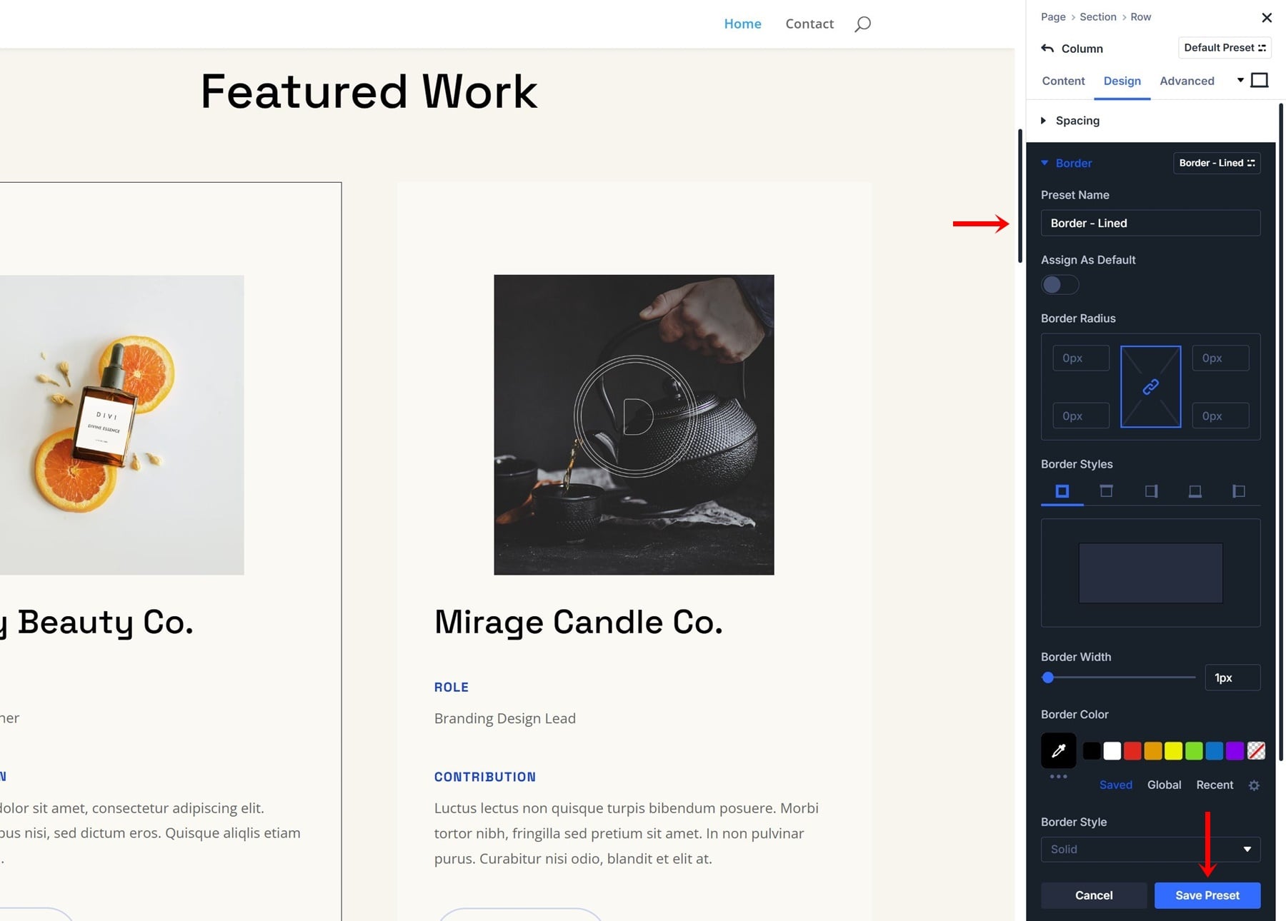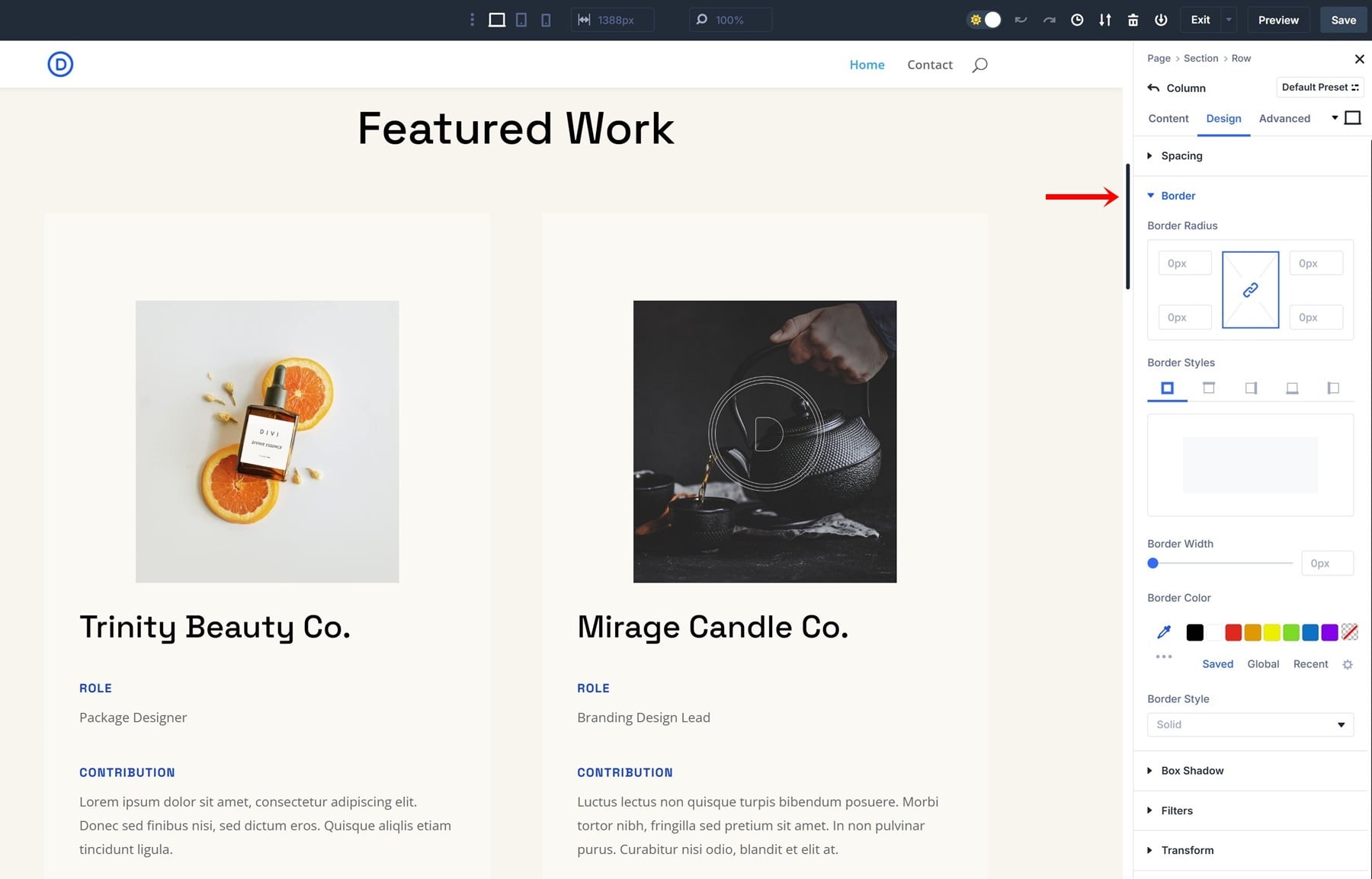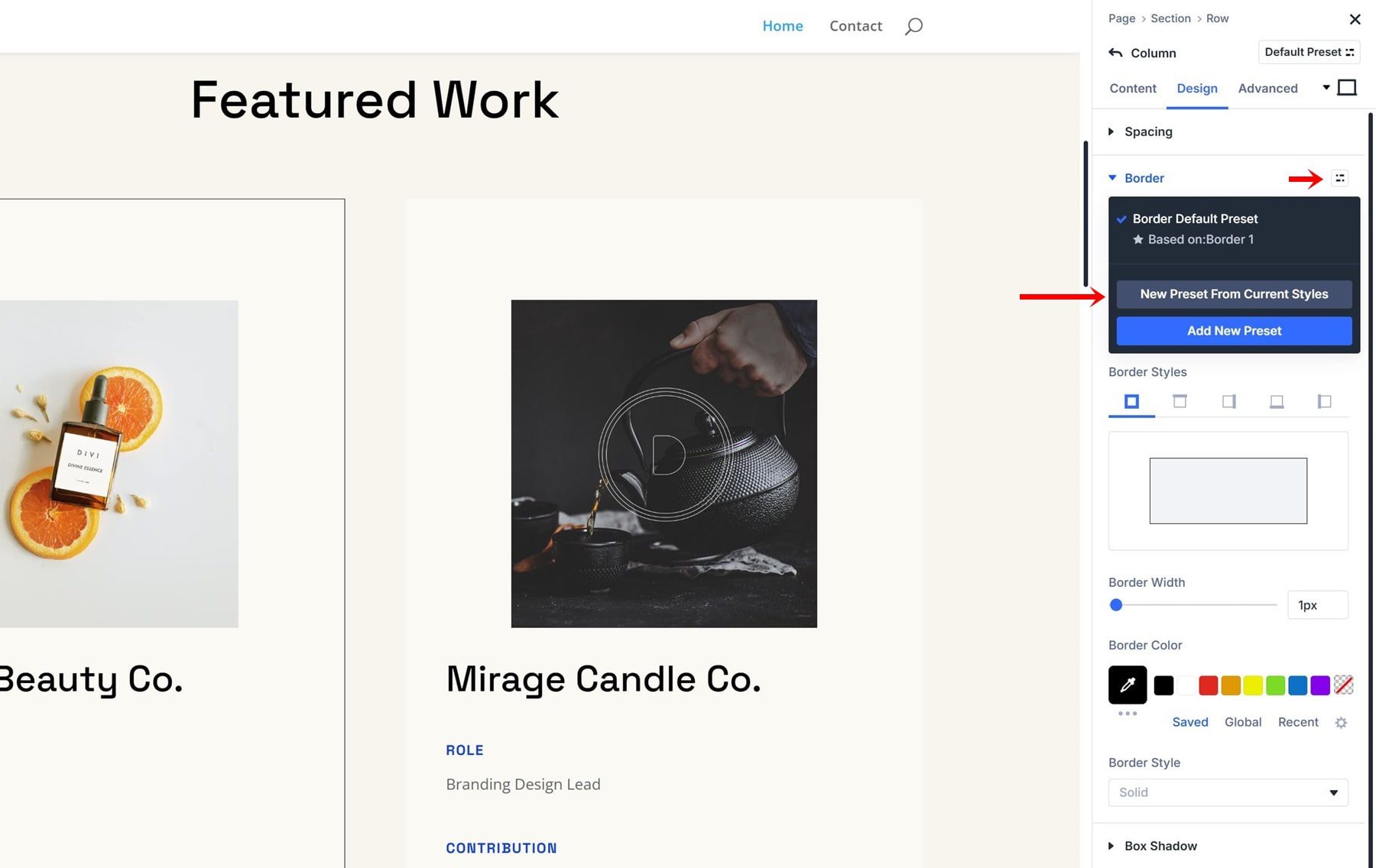 Creating an Option Group Preset is very straightforward; let’s go through the process of creating a border preset step by step. We’re using the homepage layout that comes with the Design Portfolio Layout Pack, but feel free to use any other layout of your choice.